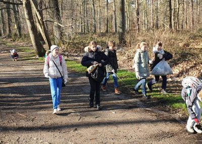 Mit Handschuhen und Müllbeuteln bewaffnet machten sich die Klassen anschließend auf den Weg, um Müll aus der Umwelt zu sammeln. Dabei kam wieder jede Menge achtlos weggewordener Unrat zusammen. Neben klassischen Abfällen wie Papier, Plastik und Glas wurden auch Metallstangen, eine Antriebswelle oder eine durchrostete Blechwanne aus dem Wald geholt.