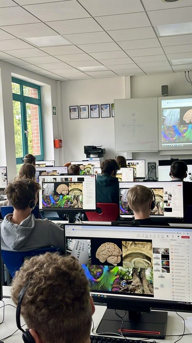 Anschließend wurden hieraus mithilfe innovativer Mikroskope, eines Supercomputers und künstlicher Intelligenz dreidimensionale, farbige „Gehirnkarten“ erschaffen. Währenddessen stand Prof. Dr. Markus Axer den Schülerinnen und Schülern in einem interaktiven Chat Rede und Antwort. Er beantwortete den Schülerinnen und Schülern unter anderem Fragen wie „Sieht man dem Gehirn an, ob ein Mensch besonders intelligent war?“ oder „Woher bekommt man ein Gehirn für die Forschung?“.